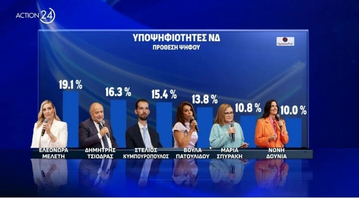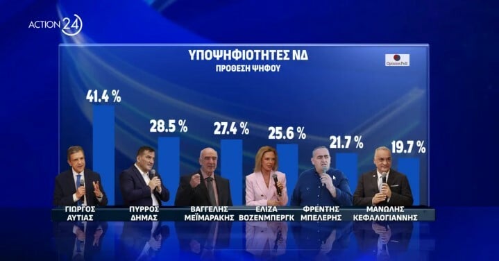 Μεταξύ των υποψηφίων ευρωβουλευτών της Νέας Δημοκρατίας φαίνεται πως προηγείται μακράν ο δημοσιογράφος Γιώργος Αυτιάς με ποσοστό 41,4%. Ακολουθεί ο Πύρρος Δήμας με 28,5%, ο Βαγγέλης Μεϊμαράκης (27,4%), η Ελίζα Βόζενμπεργκ (25,6%), ο Φρέντης Μπελέρης με 21,7%, ο Μανώλης Κεφαλογιάννης (19,7%) η Ελεονώρα Μελέτη με 19,1%, ο Δημήτρης Τσιόδρας με 16,3%. Στην ένατη θέση είναι ο Στέλιος Κυμπουρόπουλος (15,4%), στη δέκατη η Βούλα Πατουλίδου (13,8%), ακολουθεί η Μαρία Σπυράκη (10,8%) και τη δωδεκάδα κλείνει η Νόνη Δούνια με 10%.
