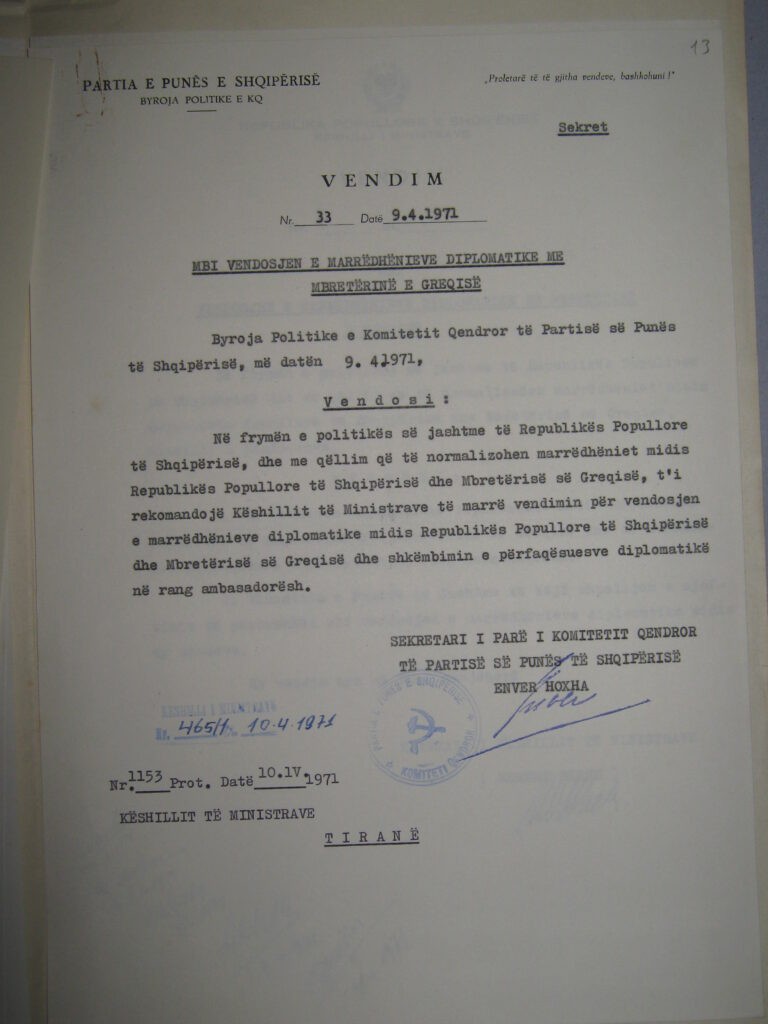 Η πρώτη ομάδα εργαζομένων της αλβανικής Πρεσβείας κατέφθασε στην Αθήνα τον Σεπτέμβριο του 1971, και την 16η Νοεμβρίου ο αλβανός πρέσβης Λικ Σεΐτι (Lik Seiti) παρέδωσε τα διαπιστευτήρια στον αντιβασιλέα Γεώργιο Ζωιτάκη, ενώ η ελληνική Πρεσβεία στα Τίρανα είχε ανοίξει νωρίτερα. Οξυδερκής και ιδιαίτερα ψυχρός –προερχόμενος από τις δομές των μυστικών υπηρεσιών και από μία πετυχημένη θητεία ως πρέσβη στο Βελιγράδι– ο Σεΐτι (καταγόμενος από το Σεβαστέρι Αυλώνας) συγκέντρωνε όλα τα γνωρίσματα ενός κατάλληλου τεχνοκράτη να χειριστεί επιδέξια τη θνησιγενή προσέγγιση, σε συνθήκες τριακονταετούς ψυχρότητας και ψυχροπολεμικής έντασης. Από την άλλη, ο έλληνας πρέσβης Διονύσιος Καραγιάννης διορίστηκε στα Τίρανα ως έμπειρος και ικανός διπλωμάτης, ο οποίος έπρεπε να αντιμετωπίσει την αλβανική δυσπιστία ως το κύριο ανάχωμα στην ανάπτυξη των σχέσεων. Μετά από ενάμιση χρόνο, όμως, αδύναμος να αντέξει την ασφυκτική αστυνομική παρακολούθηση –ενίοτε αδιάκριτη–, ο Καραγιάννης παραιτήθηκε.
