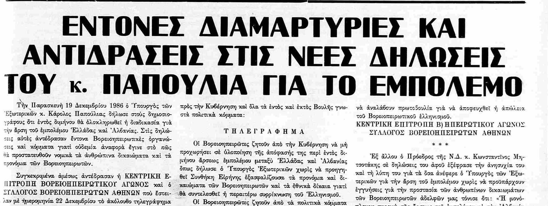 Το γεγονός όμως αυτό προκάλεσε θύελλα αντιδράσεων και έντονη νομική αμφισβήτηση για την εγκυρότητα της υπουργικής απόφασης. Την ίδια μέρα, ο Κωνσταντίνος Μητσοτάκης, αρχηγός της Νέας Δημοκρατίας δήλωνε ότι η αξιωματική αντιπολίτευση δεν θεωρεί ότι δεσμεύει κατά τίποτε τον ελληνικό λαό η σημερινή πράξη εθνικής μειοδοσίας του κ. Ανδρέα Παπανδρέου και θα συνεχίσει να παρέχει την αμέριστη συμπαράστασή της προς τους δοκιμαζόμενους βορειοηπειρώτες αδελφούς. Την 3η Νοεμβρίου 1987 συζητήθηκε στη Βουλή η επερώτηση που είχε καταθέσει η ανεξάρτητη βουλευτής Επικρατείας Βιργινία Τσουδερού η οποία άσκησε ανηλεή κριτική στον υπουργό διαφωνώντας με τη μονομερή άρση, χωρίς η Ελλάδα να αποσπάσει εγγυήσεις από την αλβανική πλευρά για τους Βορειοηπειρώτες.