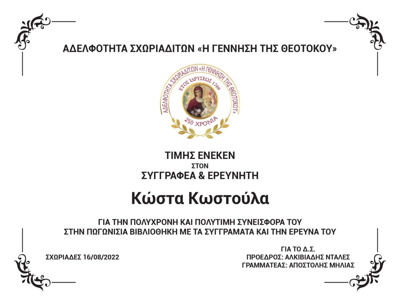 Όσοι είχαν την τύχη να ακούσουν το πόνημα του εξαίρετου συγγραφέα και ιστορικού ερευνητή κ. Κώστα Κωστούλα στην εκδήλωση στης Σχωριάδες, «Πωγωνίσοι πολιτιστικοί δρόμοι», αλλά και να διαβάσουν το επίκαιρο άρθρο του στον Πρωινό Λόγο των Ιωαννίνων «Αξιέπαινη η πρώτη Παν-Πωγωνίσια διαπολιτιστική συνεργασία», θα κατανοήσουν απόλυτα γιατί σαν Αδελφότητα Σχωριαδιτών είχαμε την εύλογη έμπνευση να τιμήσουμε αυτή την προσωπικότητα με μια λιτή πλακέτα « Τιμής ένεκεν».