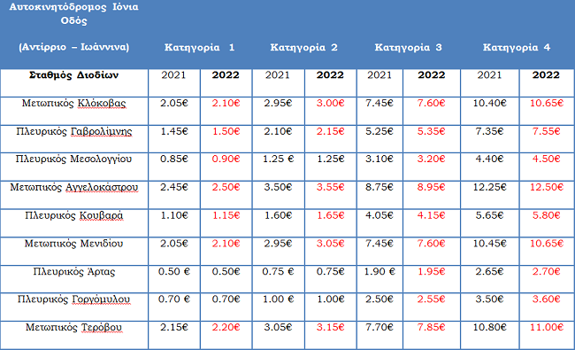 Τα νέα τέλη παρουσιάζονται αναλυτικά ανά αυτοκινητόδρομο, σταθμό διοδίων και κατηγορία οχήματος στους παρακάτω πίνακες. Με κόκκινο χρώμα παρουσιάζονται οι τιμές που έχουν αυξήσεις από 0.05€ έως 0.30€και με μαύρο χρώμα, παρουσιάζονται οι τιμές που παραμένουν αμετάβλητες σε σύγκριση με το 2021.