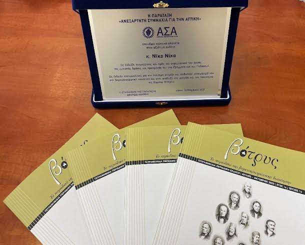 Τιμητική πλακέτα στον εκδότη κ. Νίκο Νίκα ως ένδειξη αναγνώρισης και τιμής του συγγραφικού του έργου και της πολυετής δράσης και προσφοράς του στα Γράμματα και τον Πολιτισμό, απένειμε ο Επικεφαλής της παράταξης «Ανεξάρτητη Συμμαχία για την Αττική» κ. Ανδρέας Κούρτης. Η απονομή πραγματοποιήθηκε το πρωί της Παρασκευής 18 Νοεμβρίου 2022 στα γραφεία της παράταξης, στην Περιφέρεια Αττικής. Στην απονομή παραβρέθηκαν η συνεργάτης του Περιφερειάρχη Αττικής και υπεύθυνη για θέματα Απόδημου Ελληνισμού, κα. Αμαλία Ρόντου καθώς και οι δημοσιογράφοι κα. Άννα Τσίμου και κα. Ελένη Καραθάνου.