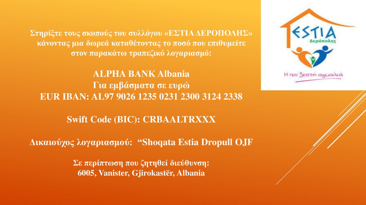 Παρατίθενται οι κάρτες με τους τραπεζικούς λογαριασμούς και τα στοιχεία επικοινωνίας του συλλόγου «Εστία Δερόπολης»