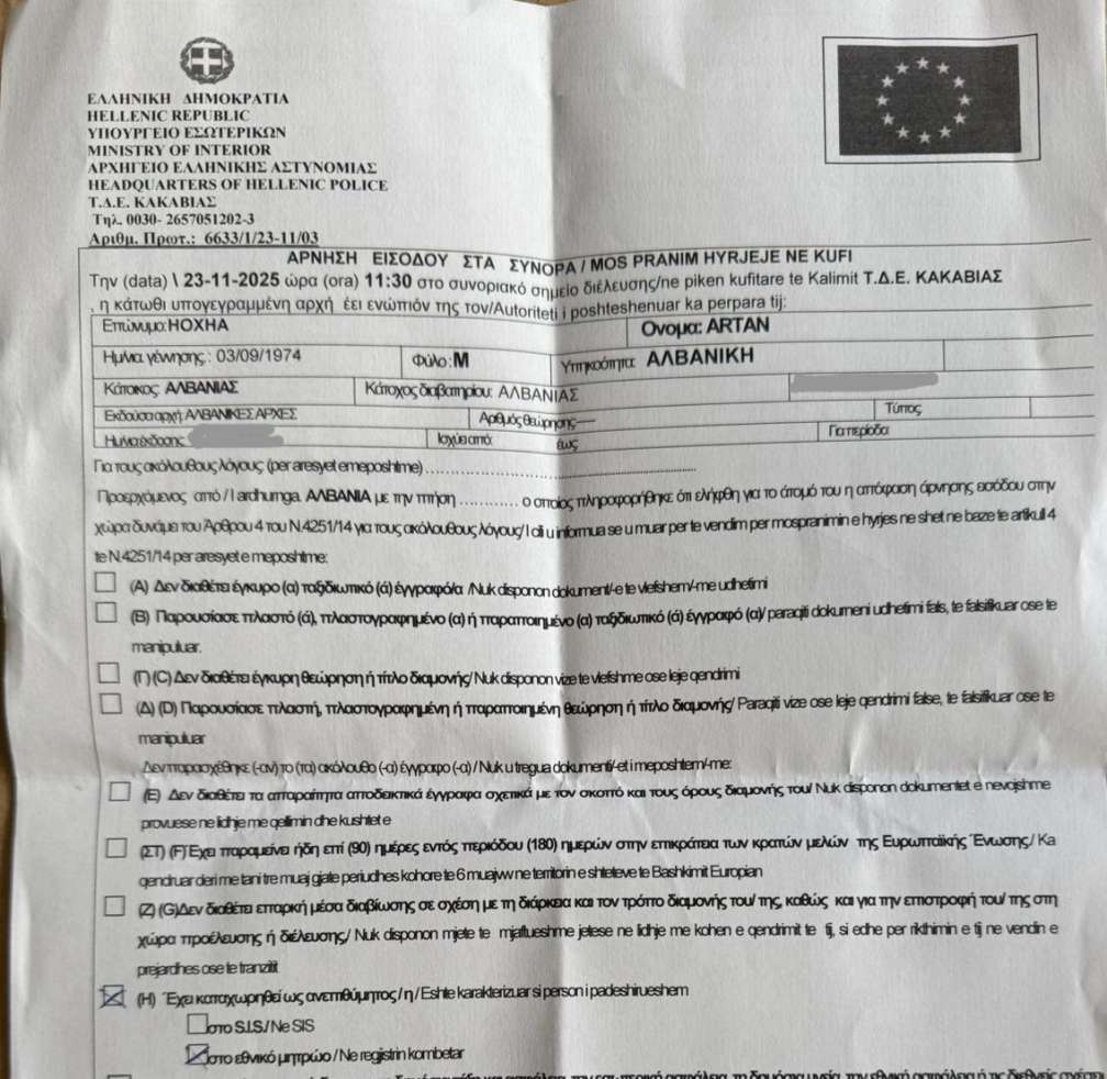 Οι Ελληνικές Αρχές κήρυξαν χθες ως persona non grata τον Αλβανό δημοσιογράφο Artan Hoxha, χαρακτηρίζοντάς τον ανεπιθύμητο και απειλή για τη δημόσια τάξη, απαγορεύοντάς του οριστικά την είσοδο στο ελληνικό έδαφος. Το περιστατικό σημειώθηκε στο συνοριακό σημείο διέλευσης της Κακαβιάς, όπου ο Χότζα ταξίδευε προς τα Ιωάννινα.