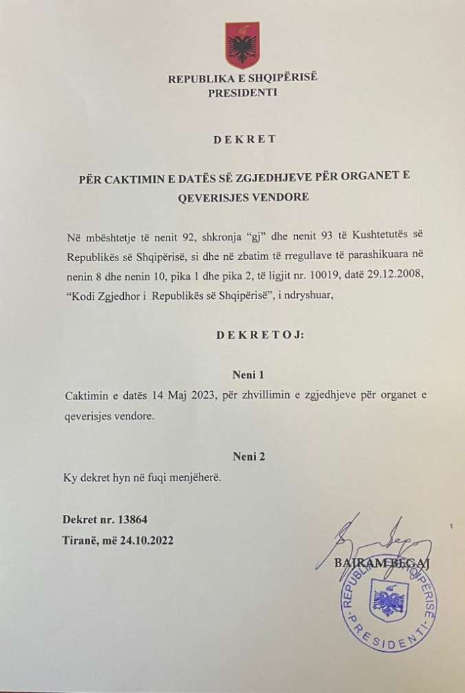 Ο Πρόεδρος Bajram Begaj όρισε την 14η Μαΐου 2023 ως ημερομηνία των επόμενων δημοτικών εκλογών.