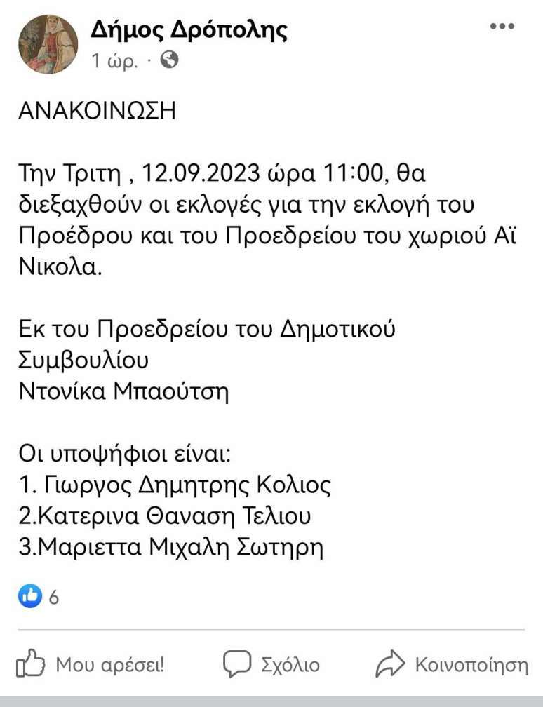 Το χαβά τους στο Δημαρχείο Δρόπολης ανακοίνωσαν όσον αφορούν τις εκλογές στα χωριά. Σήμερα ανακοίνωσαν εκλογές στο χωριό Αη Νικόλα μια ώρα πριν την διεξαγωγή τους, στις 11:00 τοπική ώρα.