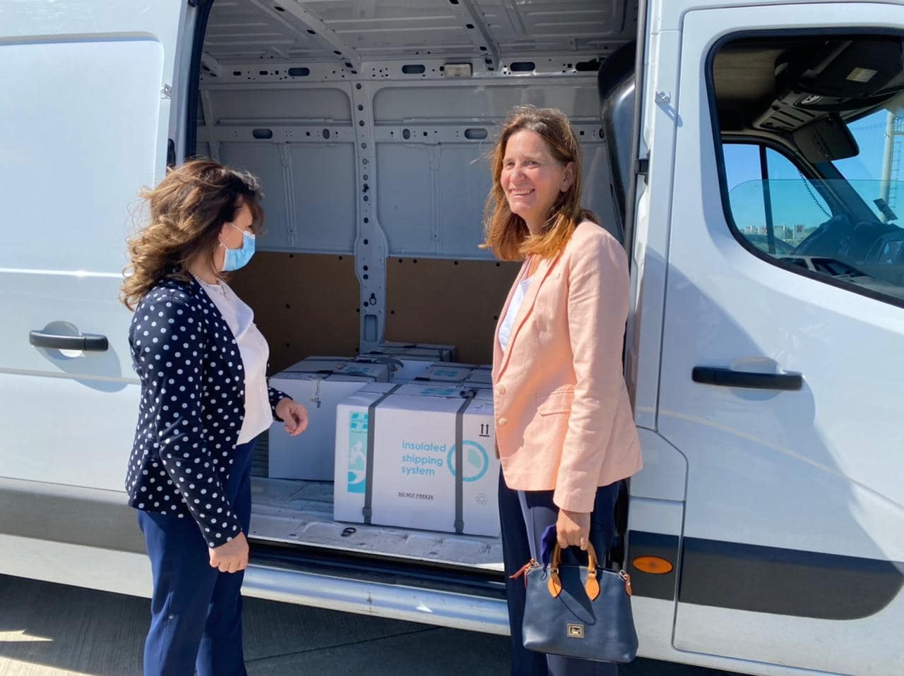 Παρουσία της πρέσβη της Ελλάδας στην Αλβανία, Σοφίας Φιλιππίδου, παρέλαβε τα εμβόλια η Αλβανίδα υφυπουργός Υγείας Εουγκένα Τομίνι.