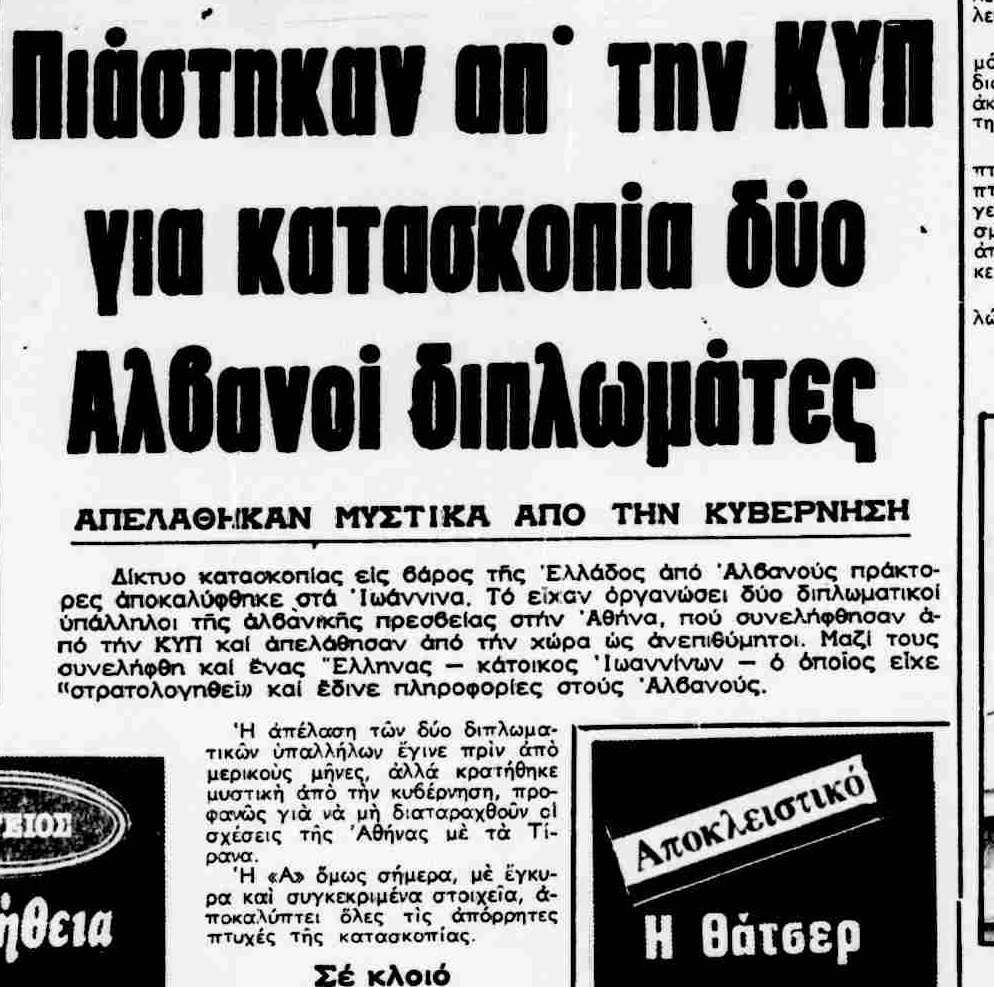 Η απέλαση των αλβανών διπλωματών τηρήθηκε μυστική και διέρρευσε στον τύπο ένα χρόνο αργότερα. Συγκεκριμένα, η εφημερίδα «Ακρόπολις» την 25η Νοεμβρίου 1984 σε ένα κείμενο με πηχυαίο τίτλο έφερνε στο φως την απέλαση δυο αλβανών διπλωματών, συλλαμβανομένων από την ΚΥΠ και κατηγορουμένων για διενέργεια κατασκοπίας εις βάρος της Ελλάδας. Σύμφωνα με την εφημερίδα, ίχνη της μυστικής δράσης των δύο αλβανών διπλωματών είχαν βρεθεί στα Ιωάννινα, όπου συνελήφθησαν επ' αυτοφώρω μαζί με άλλους έλληνες πολίτες, κατοίκους των Ιωαννίνων, οι οποίοι είχαν στρατολογηθεί και παρείχαν απόρρητες πληροφορίες. Για μεγάλο χρονικό διάστημα οι αλβανοί διπλωμάτες ήταν σε ασφυκτικό κλοιό από τις ελληνικές υπηρεσίες στις προσπάθειές τους να συλλέξουν πληροφορίες για τις κινήσεις των βορειοηπειρωτών φυγάδων, τη διάταξη των στρατιωτικών τμημάτων στα σύνορα και λοιπές απόρρητες πληροφορίες στρατιωτικού και οικονομικού χαρακτήρα. Σύμφωνα με δημοσιογραφικές πληροφορίες της εφημερίδας, στα Ιωάννινα είχαν νοικιάσει διαμέρισμα σε συγκεκριμένο σημείο όπου διεξάγονταν μυστικές συναντήσεις με πληροφοριοδότες τους. Η συνεννόηση διεξάγονταν με κωδικοποιημένο σύστημα και διάφορα ψευδώνυμα. Κατά την έρευνα, συγκεντρώθηκαν τα απαραίτητα ενοχοποιητικά στοιχεία εις βάρος των αλβανών, όπως σχεδιαγράμματα, χάρτες των ελληνοαλβανικών συνόρων, ανθελληνικά έντυπα κ.λπ.