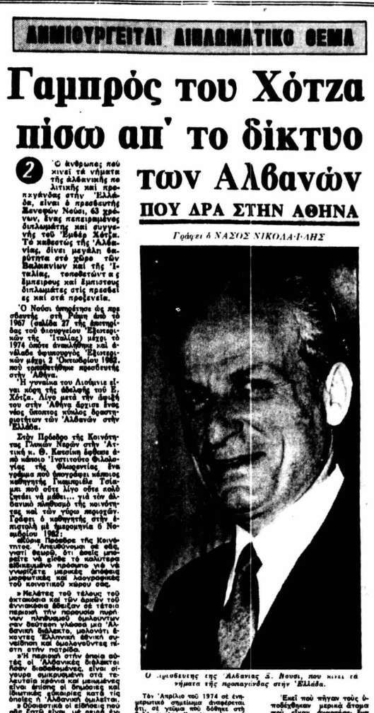 Σε αυτό το κλίμα, στις αρχές του 1982, ο ίδιος ο Ενβέρ Χότζα κάλεσε στην οικεία του τον Ξενοφώντα Νούση (Ksenofon Nushi) και του ανακοίνωσε προσωπικά τον διορισμό του ως πρέσβυ της Αλβανίας στην Αθήνα με συγκεκριμένα παραγγέλματα: βασικός στόχος – η βελτίωση των σχέσεων. Ο Νούση αντικαταστούμε έναν αγέρωχο διπλωμάτη καριέρας, τον Λικ Σεΐτι (Lik Seiti), ο οποίος υπήρξε ο πρώτος πρέσβυς μετά την διπλωματική ανασύνδεση των δύο χωρών (Μάιος 1971) και τον λιγοστό Μπασκίμ Ντίνο(Bashkim Dino) στη συνέχεια.