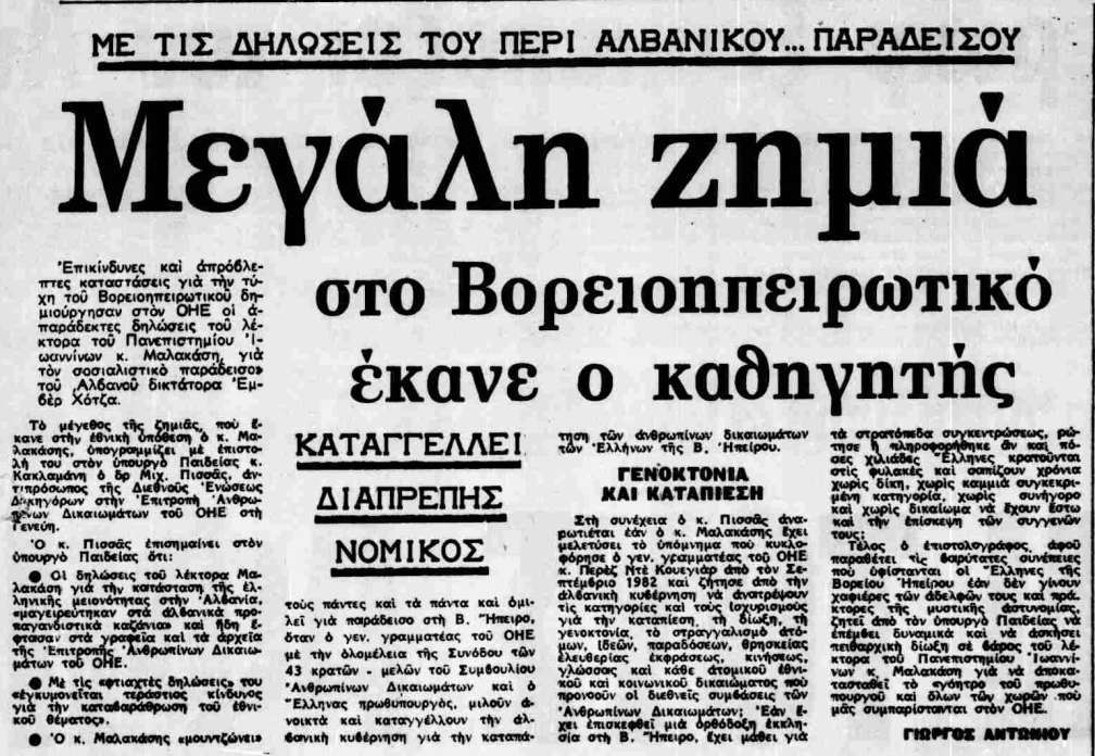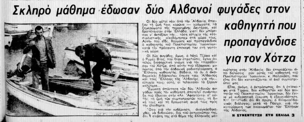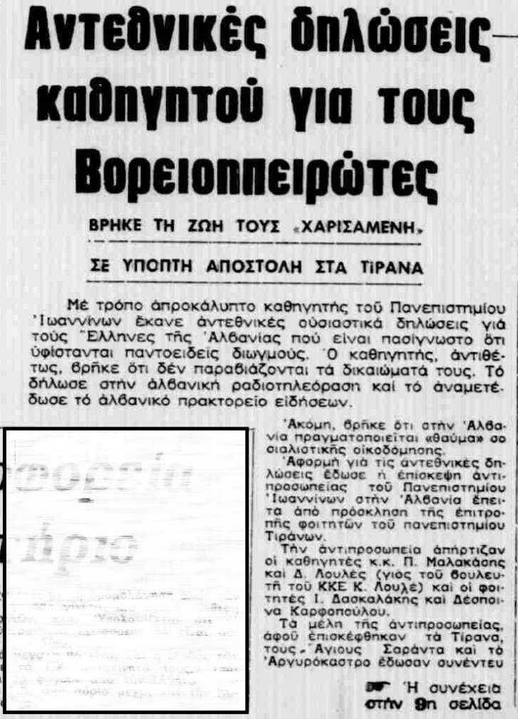 Στην Ελλάδα, από την άλλη, κυβερνητικοί κύκλοι, με μια δόση ανεξήγητης απλοϊκότητας και πολιτικής αφέλειας δέχθηκαν με ικανοποίηση τόσο τις επίσημες διακηρύξεις του Χότζα για φιλία και συνεργασία με τον ελληνικό λαό, όσο και τις θερμές προτροπές του προς την ελληνική μειονότητα για την ανάγκη διαφύλαξης της γλώσσας και της πνευματικής κληρονομιάς της. Οι δηλώσεις αυτές ανταποκρίνονταν στη σταθερή πολιτική της Ελλάδας για την ανάπτυξη των σχέσεων φιλίας και καλής γειτονίας με την Αλβανία. Όλοι αυτοί, όμως, έβλεπαν το προπέτασμα αλλά όχι την ουσία.