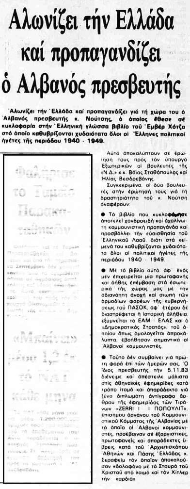 Στο μεταξύ, η αλβανική πρεσβεία, κατά τρόπο προκλητικό, διοργάνωνε διάφορες εκδηλώσεις με σκοπό την ανάδειξη της προσωπικότητας του Ενβέρ Χότζα, τον οποίο εμφάνιζε (και) ως συγγραφέα. Τον Σεπτέμβριο 1983 η ΔΕΘ παραχώρησε περίπτερο στην Αλβανία, η οποία εξέθεσε προπαγανδιστικά βιβλία του Ενβέρ Χότζα, όπως οι «Τιτοϊκοί» ενώ κοσμούσε τον χώρο μεγάλη φωτογραφία του αλβανού δικτάτορα και αυτό προκάλεσε κύμα έντονων αντιδράσεων. Την 22η Σεπτεμβρίου 1983 ο πολιτικός διευθυντής του Υπουργείο Εξωτερικών Τίτος Κωνσταντόπουλος κάλεσε τον Νούση στο Υπουργείο και, αφού του εξέφρασε τη δυσαρέσκειά του, τού είπε ότι έπρεπε να καταβιβάσει τη φωτογραφία και να αφαιρέσει τα επίμαχα βιβλία και τα προπαγανδιστικά φυλλάδα. Την 24η Σεπτεμβρίου 1983 οι διοργανωτές διέταξαν την πρεσβεία να αποσύρει τα εκθέματα και να κλείσει το περίπτερο, αφού δεν συμμορφωνόταν με τις επιταγές του Υπουργείου και τους κανονισμούς της έκθεσης. Το ίδιο συνέβη και στην έκθεση βαλκανικού βιβλίο στο Πεδίον του Άρεως στην Αθήνα: η αλβανική πρεσβεία εξέθεσε προπαγανδιστικό υλικό κατά της Γιουγκοσλαβίας με τεράστιες φωτογραφίες του «συγγραφέα» Ενβέρ Χότζα. Αυτό πυροδότησε νέο κύμα αντιδράσεων και κατακραυγή. Οι Αλβανοί απέσυραν και πάλι το υλικό και αναγκάστηκαν να αποχωρήσουν και από αυτήν την έκθεση.