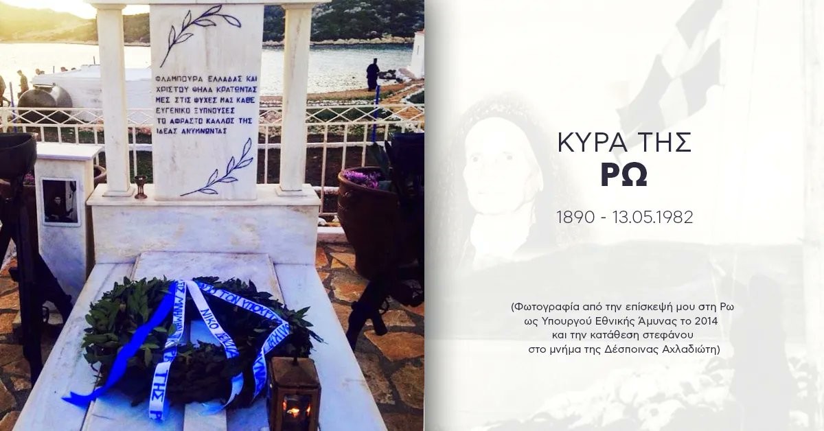 «40 χρόνια από τον θάνατο της Κυράς της Ρω. Δεν ξεχνάμε τη Δέσποινα Αχλαδιώτη, που αφιέρωσε τη ζωή της στο να φυλάττει «Θερμοπύλες», ανέφερε ο κ. Δένδιας.