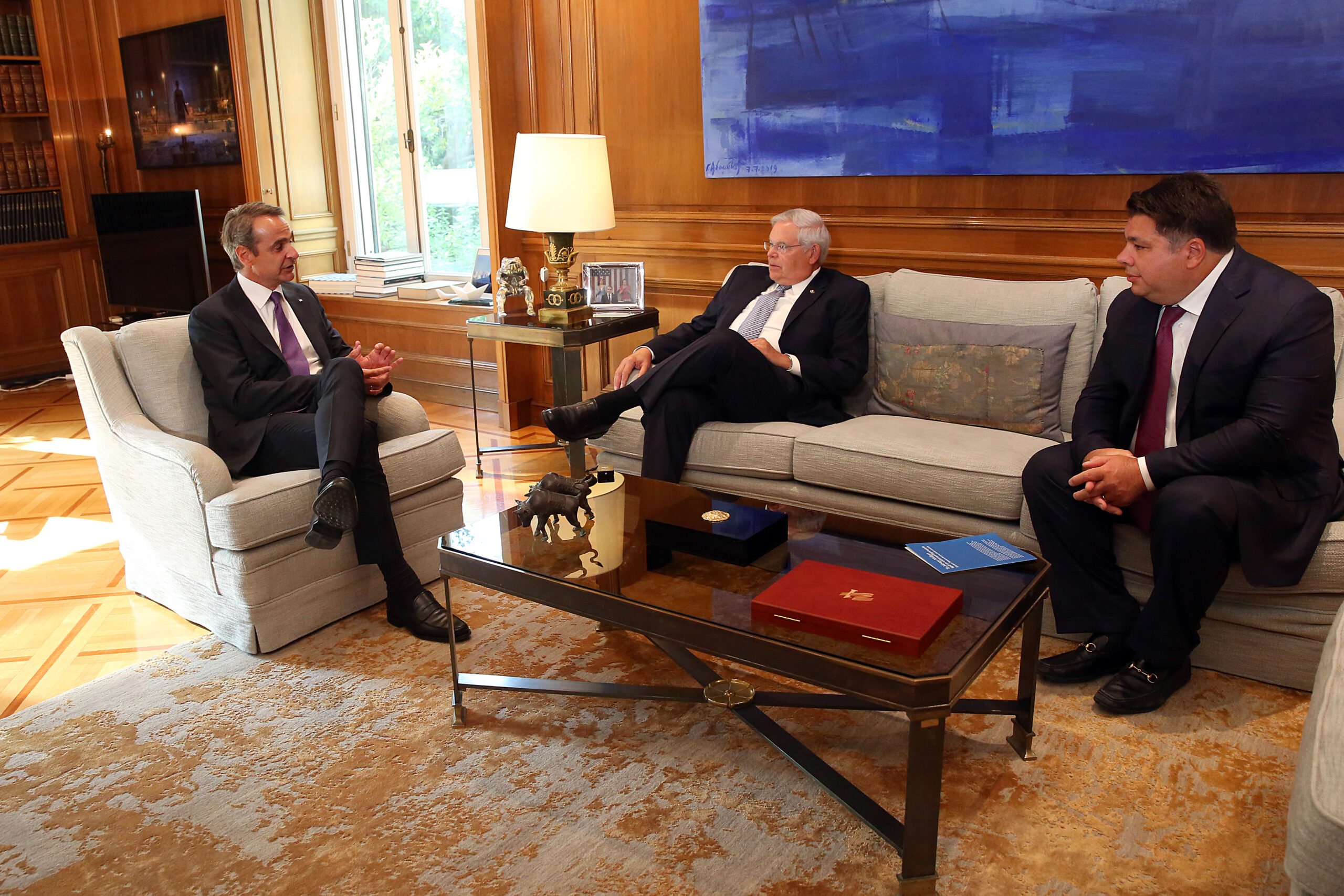 Ο Πρωθυπουργός Κυριάκος Μητσοτάκης συναντήθηκε, στο Μέγαρο Μαξίμου, με τον Πρόεδρο της Επιτροπής Εξωτερικών Σχέσεων της Γερουσίας των Ηνωμένων Πολιτειών, Robert Menendez, λίγο πριν από την αναγόρευσή του Αμερικανού Γερουσιαστή σε Επίτιμο Διδάκτορα του ΕΚΠΑ.