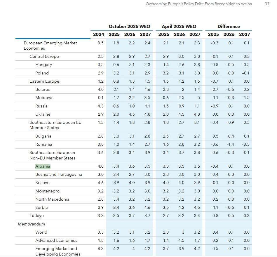 Συνολικά, η ομάδα των χωρών της Νοτιοανατολικής Ευρώπης εκτός ΕΕ αναμένεται να αναπτυχθεί κατά 2,8% το 2025, από 3,4% που προέβλεπε η προηγούμενη έκθεση του ΔΝΤ.