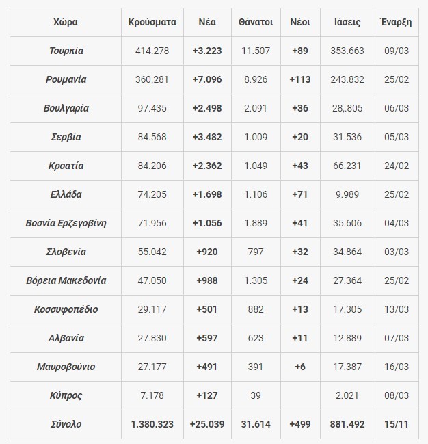 Βαλκάνια - Covid: 1.380.323 κρούσματα, 31.614 θάνατοι