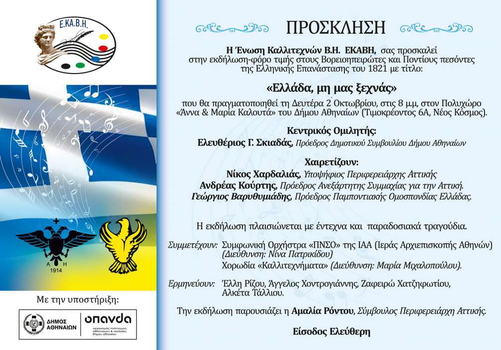 Η Ένωση Καλλιτεχνών Β.Η. «ΕΚΑΒΗ», με την στήριξη του ΟΠΑΝΔΑ διοργανώνει εκδήλωση-φόρο τιμής στους Βορειοηπειρώτες και Ποντίους αγωνιστές της Ελληνικής Επανάστασης του 1821 με τίτλο: