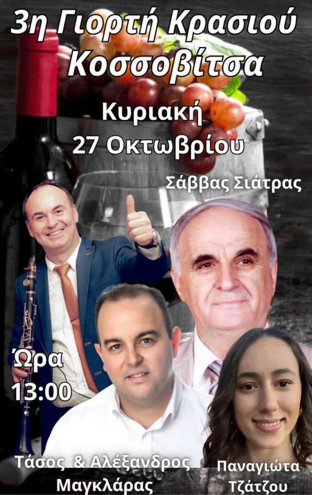 Η αδελφότητα Άγιος Γεώργιος Κοσσοβίτσας διοργανώνει την 3η γιορτή κρασιού την Κυριακή 27 Οκτωβρίου στις 13:00 στην Κοσσοβίτσα.