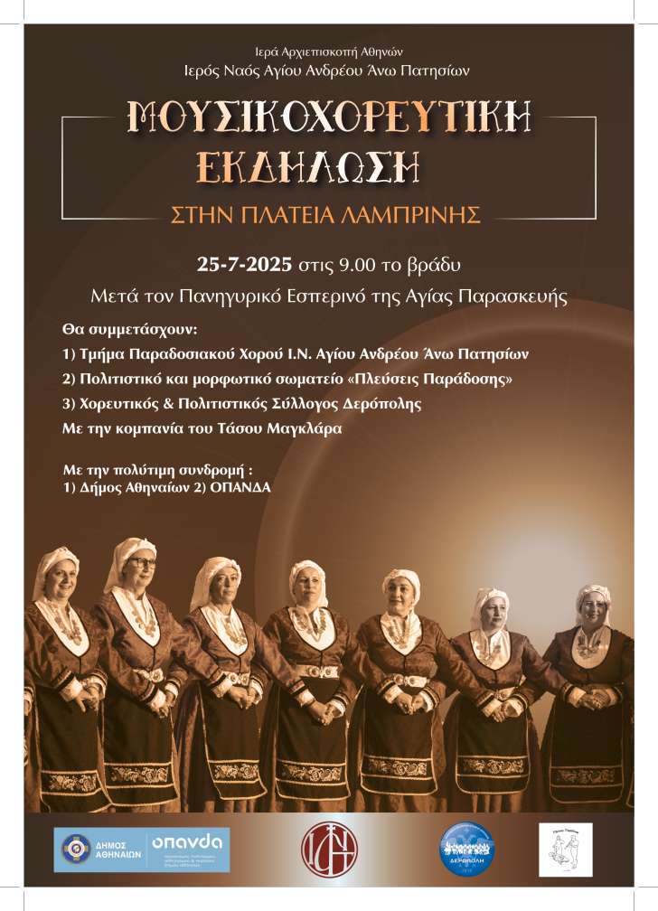 Η Ιερά Αρχιεπισκοπή Αθηνών και ο Ιερός Ναός Αγίου Ανδρέα Άνω Πατησίων προσκαλούν μικρούς και μεγάλους σε μια μοναδική μουσικοχορευτική βραδιά, που θα πραγματοποιηθεί την Παρασκευή 25 Ιουλίου 2025, στις 9:00 το βράδυ, στην Πλατεία Λαμπρινής, αμέσως μετά τον Πανηγυρικό Εσπερινό της Αγίας Παρασκευής.